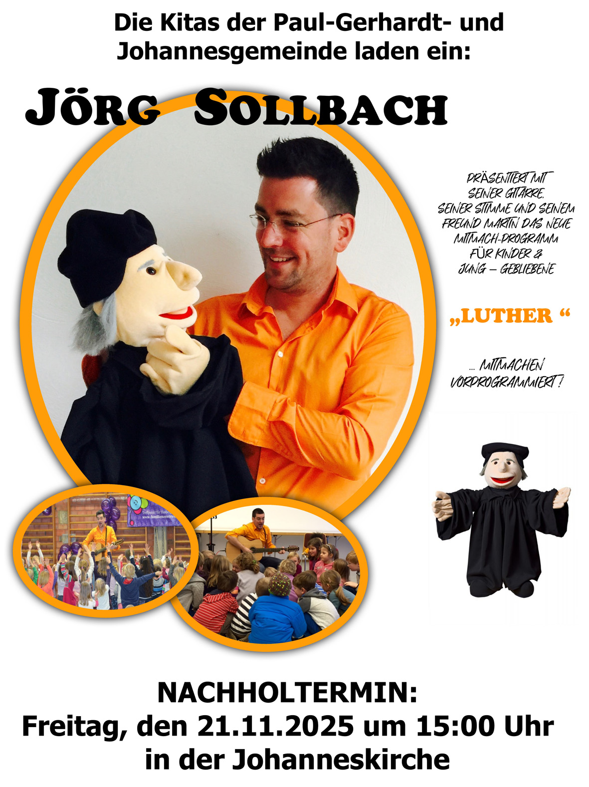 Die Kindertagesstätten der Johannes- und Paul Gerhardt-Gemeinden - Kita Löwenzahn, Kita Friedrich-Fröbel-Haus und Kita Wittenberg-Haus - laden ein zu einem Familien-Mitmach-Konzert in der Johanneskirche. Rund um Martin Luther und die spannende Geschichte der Reformation präsentiert der christliche Liedermacher Jörg Sollbach sein Konzertprogramm "Luther" für Kinder & Junggebliebene.