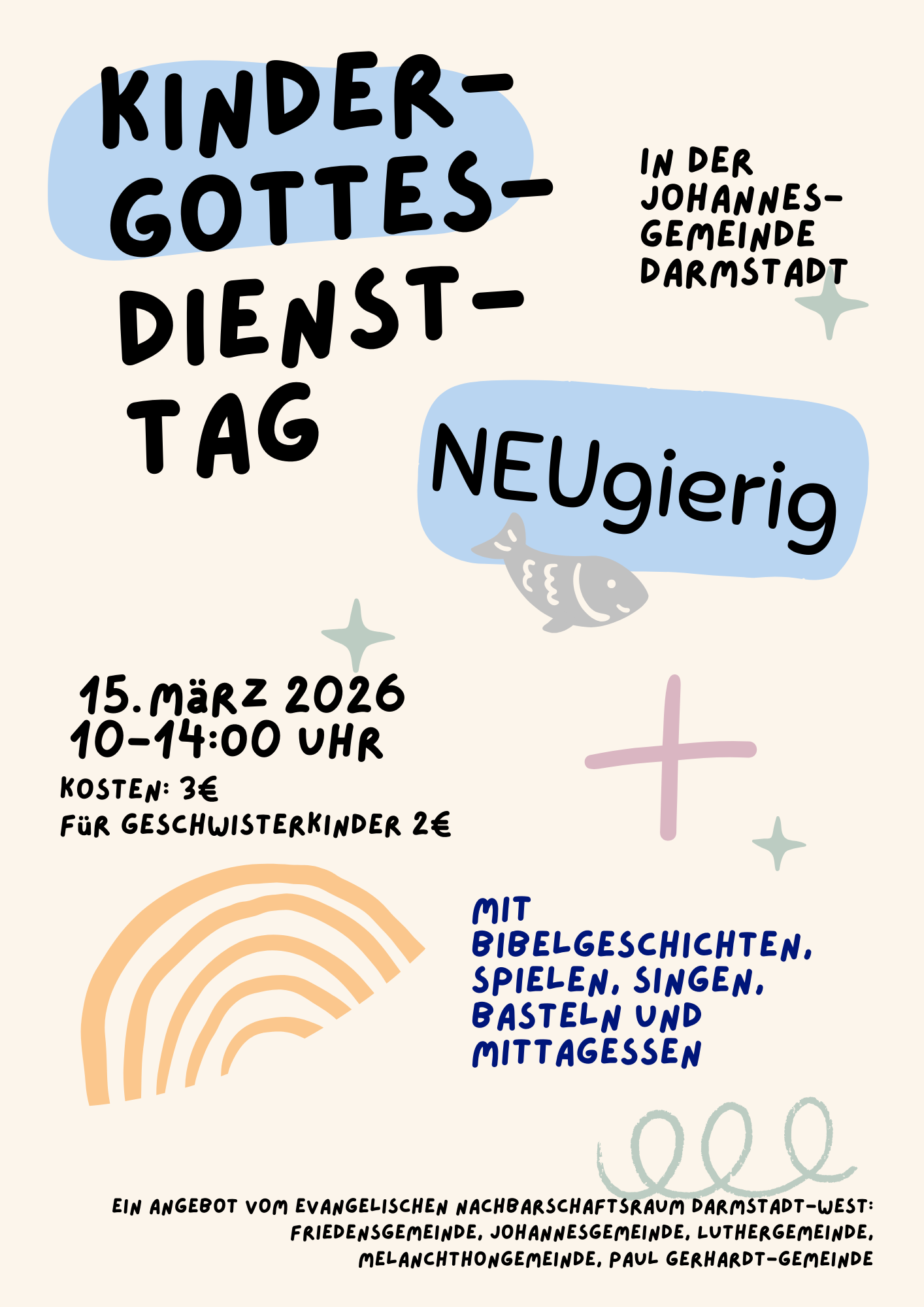 Am 15. März treffen sich alle Kinder aus dem Nachbarschaftsraum zum Kindergottesdienst-Tag, dieses Mal in der Johannesgemeinde. Unter dem Thema „NEUgierig“ hören wir eine Geschichte, singen, spielen und basteln. Wie immer gibt es auch ein gemeinsames Mittagessen. Eingeladen sind alle Kinder von 4-12 Jahren, diese müssen sich vorher in den Gemeinden anmelden.